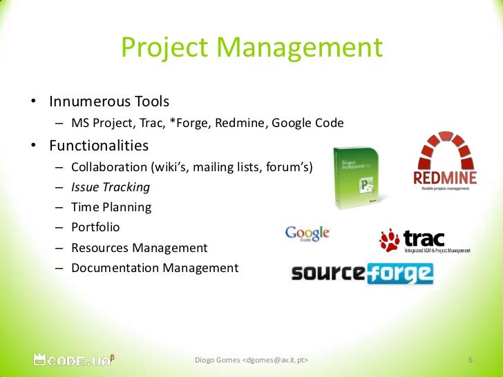 6. 6. Project Management<br />Innumerous Tools<br />MS Project, Trac, *Forge, Redmine, Google Code<br />Functionalities<br />Collaboration (wiki’s, mailing lists, forum’s)<br />Issue Tracking<br />Time Planning<br />Portfolio<br />Resources Management<br />Documentation Management<br />6<br />Diogo Gomes <dgomes@av.it.pt><br />