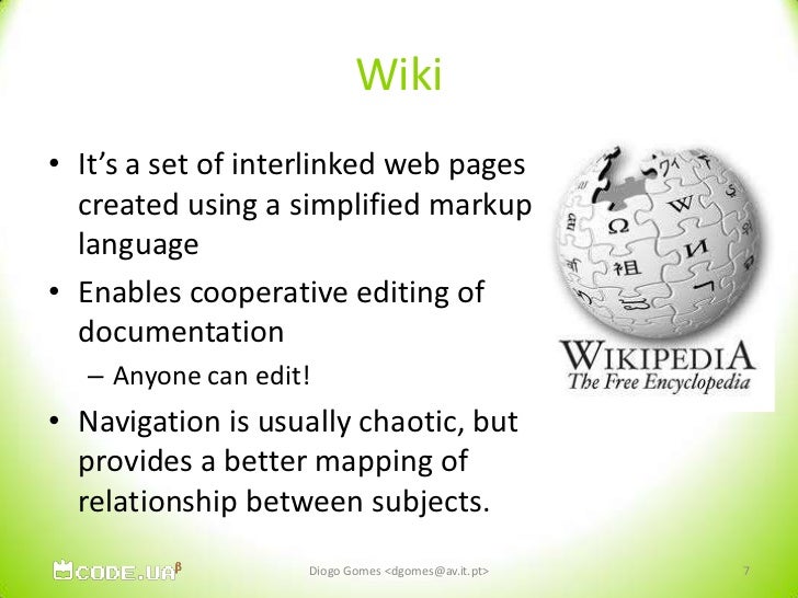 7. 7. Wiki<br />It’s a set of interlinked web pages created using a simplified markup language<br />Enables cooperative editing of documentation<br />Anyone can edit!<br />Navigation is usually chaotic, but provides a better mapping of relationship between subjects.<br />Diogo Gomes <dgomes@av.it.pt><br />7<br />