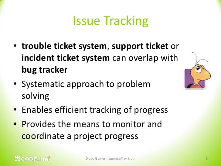 8. 8. Issue Tracking<br />trouble ticket system, support ticket or incident ticket system can overlap with bug tracker<br />Systematic approach to problem solving<br />Enables efficient tracking of progress<br />Provides the means to monitor and coordinate a project progress<br />Diogo Gomes <dgomes@av.it.pt><br />8<br />