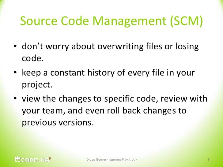 9. 9. Source Code Management (SCM)<br />don’t worry about overwriting files or losing code. <br />keep a constant history of every file in your project. <br />view the changes to specific code, review with your team, and even roll back changes to previous versions. <br />Diogo Gomes <dgomes@av.it.pt><br />9<br />