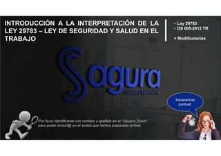 La ley y reglamento de seguridad y salud en el trabajo establecen los principios y disposiciones generales aplicables. Los nueve principios incluyen la prevención, responsabilidad, cooperación, información y capacitación, atención integral de la salud, consulta y participación, primacía de la realidad y protección. El objetivo es promover una cultura de prevención de riesgos laborales que involucre al Estado, empleadores y trabajadores. La ley es aplicable a todos los sectores económicos y de servicios en el territorio nacional.