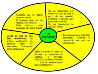 Este documento presenta la estructura y componentes de una solicitud. Explica que una solicitud contiene una sumilla, el destinatario, el saludo, los datos generales del solicitante, el texto con la parte considerativa y la petición, y una despedida. También incluye un modelo de solicitud con cada una de estas partes.