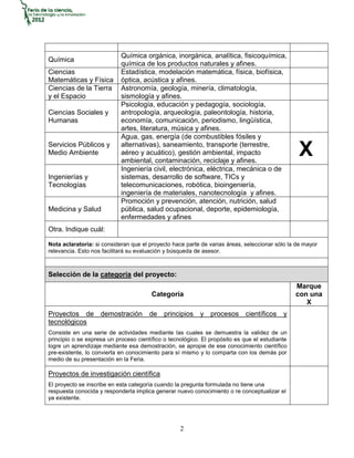 Este documento proporciona un formato para presentar proyectos de investigación en la Feria de la Ciencia, la Tecnología y la Innovación de 2012. El formato solicita información general sobre el proyecto, como el título, área temática, categoría e investigadores. Los estudiantes deben completar este formato para describir su proyecto de investigación y recibir asesoría para su desarrollo y presentación.