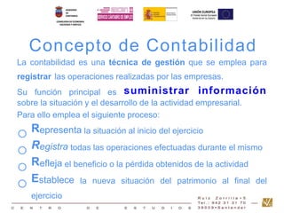 La contabilidad es una técnica que se usa para registrar las operaciones de las empresas y proveer información sobre su situación y desarrollo a través del tiempo. Consta de cuatro fases: elaboración de registros contables, comunicación de la información, verificación de los estados financieros por auditores externos, y análisis e interpretación de la información por los usuarios para tomar decisiones.
