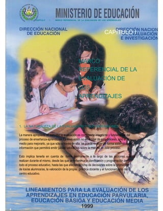 Este documento presenta el marco referencial de la evaluación de los aprendizajes. Define la evaluación como parte integral del proceso de enseñanza-aprendizaje y describe sus dimensiones, principios, características y funciones. Explica que la evaluación debe ser holística, integradora, continua, motivadora, justa, objetiva, sistemática y participativa. Además, detalla lo que se debe evaluar, para qué, cómo, cuándo y las funciones diagnóstica y orientadora de la evaluación.