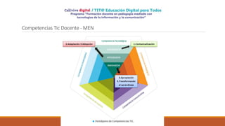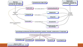 El documento describe un diplomado de formación docente en pedagogía mediada con tecnologías de la información y la comunicación. El diplomado se divide en 5 momentos: 1) contextualización, 2) adaptación, 3) adopción, 4) apropiación, y 5) transformando el aprendizaje, donde los docentes desarrollan competencias Tic a través de actividades prácticas que incorporan las TIC en su enseñanza.