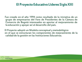 El Proyecto Educativo Líderes Siglo XXI fue creado en 1994 por empresarios para mejorar la calidad de la educación. El proyecto implementa un modelo de mejoramiento de gestión en instituciones educativas con el apoyo de voluntarios empresariales. El objetivo es contribuir a la formación integral de estudiantes y al desarrollo del país.