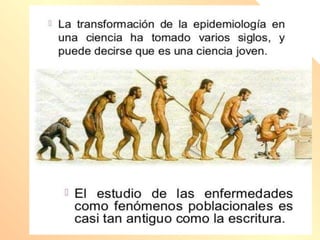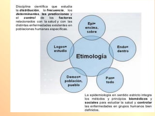 El documento proporciona una introducción a los principios básicos de la epidemiología, enfatizando su importancia para abordar problemas de salud mediante la identificación, análisis y control de enfermedades en poblaciones. Se discuten los diferentes estudios epidemiológicos, su enfoque en la distribución y determinación de salud y enfermedad, así como la necesidad de intervenciones adecuadas para el control de problemas de salud. Además, se abordan conceptos como determinantes de salud y los métodos para evaluar y mejorar la salud pública.
