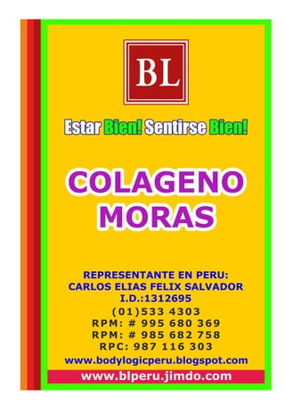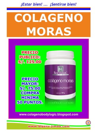 El documento presenta información sobre el colágeno bioactivo, una proteína esencial para la salud de la piel, cartílago y huesos, que destaca por su alta concentración de aminoácidos y facilidad de incorporación en alimentos y bebidas. Se detalla un producto específico, una mezcla en polvo de colágeno con sabor a moras, que promueve la belleza desde el interior y contribuye al control de peso y salud articular. El colágeno es presentado como un componente clave para mantener una piel joven y saludable.