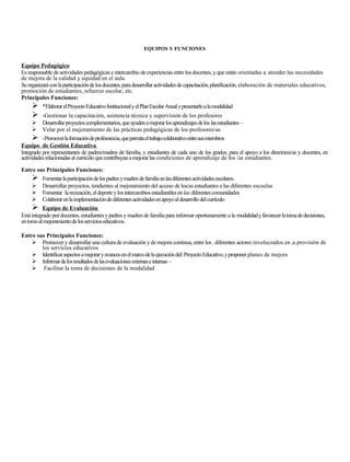 El documento describe tres equipos y sus funciones principales. El Equipo Pedagógico es responsable de actividades de capacitación docente y mejora de la calidad educativa. El Equipo de Gestión Educativa integra a padres, estudiantes y representantes para apoyar a directores y docentes en mejorar el aprendizaje. El Equipo de Evaluación, formado por docentes, padres y estudiantes, promueve una cultura de evaluación continua para identificar áreas de mejora y apoyar la toma de decisiones.