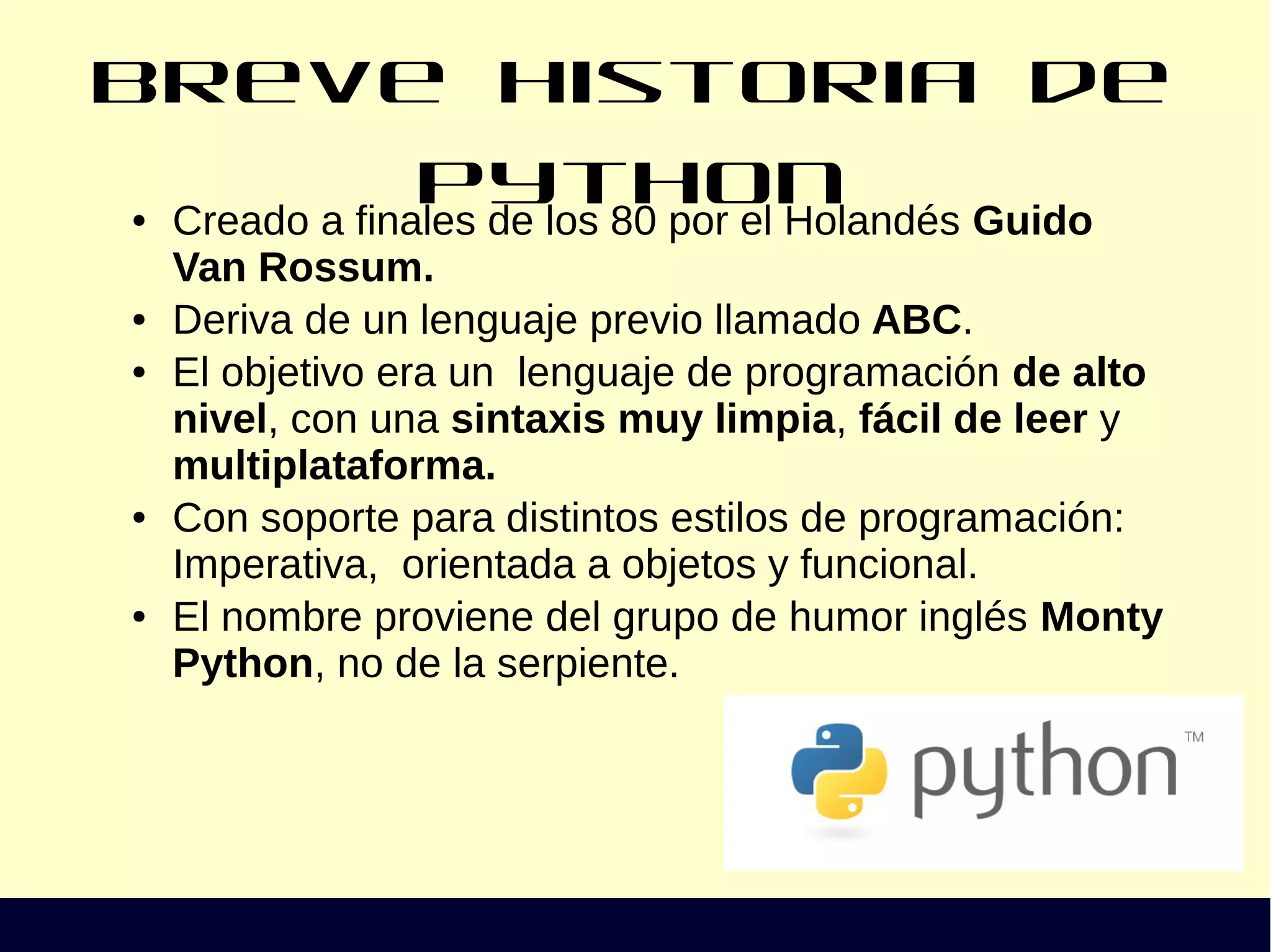 Este documento introduce Python. Brevemente describe su historia y cómo fue creado por Guido van Rossum a fines de los 80. Explica las diferencias entre Python 2.7 y 3.x y por qué se usará Python 2.7 en el taller. También resume las ventajas de Python como su desarrollo rápido, simplicidad, legibilidad, ser de código abierto y fácil de extender.