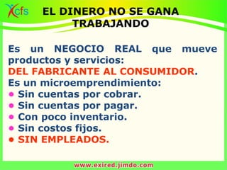 El documento describe el modelo de negocio de networking o marketing en red como una alternativa viable frente a los tradicionales, destacando su bajo costo inicial, ausencia de empleados y flexibilidad operativa. Además, se menciona que el networking permite obtener diferentes fuentes de ingresos y que es accesible para cualquier persona. Se presenta como una opción más justa y efectiva para la distribución de productos y servicios en comparación con las corporaciones tradicionales.