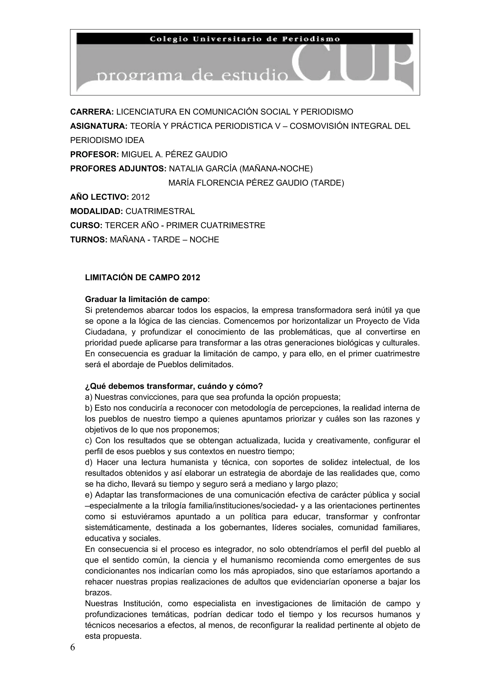 Este documento presenta la asignatura Teoría y Práctica Periodística V en el Colegio Universitario de Periodismo. Incluye los objetivos de la asignatura, que son afianzar los conocimientos de los estudiantes sobre el periodismo contemporáneo desde una perspectiva ética y cultural. También presenta los contenidos, la planificación de clases, la metodología, los criterios de evaluación y la bibliografía.