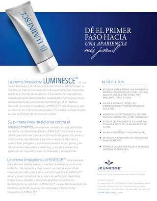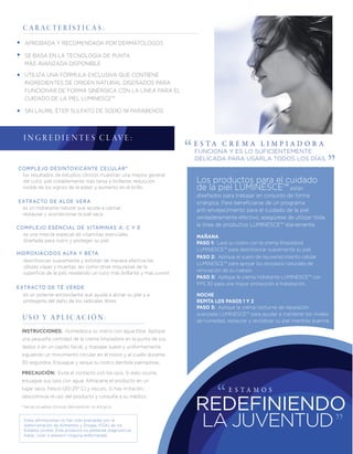 La crema limpiadora Luminesce™ es un producto facial que protege la hidratación de la piel mientras elimina impurezas, formulada por el dermatólogo Dr. Nathan Newman. Este gel ligero promueve una apariencia juvenil, previene acné y mejora la textura de la piel a nivel celular, gracias a una combinación de hidroxiácidos y nutrientes. Se recomienda su uso como parte de un régimen completo de cuidado de la piel Luminesce™ para obtener resultados anti-envejecimiento efectivos.