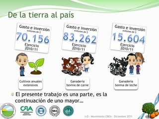 Este documento resume un estudio sobre los gastos e inversiones en cultivos plurianuales en Argentina durante 2010-2011. Se analizaron más de 2 millones de hectáreas de 32 cultivos en 22 provincias, identificando los principales rubros de gasto como mano de obra, mantenimiento e insumos. Mendoza y Tucumán representaron el 41% del gasto total, concentrado principalmente en cinco provincias.