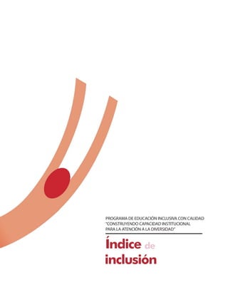 Este documento presenta una herramienta llamada Índice de Inclusión para que las instituciones educativas realicen un proceso de autoevaluación de su gestión inclusiva. El Índice contiene dos cuestionarios que evalúan cuatro áreas de gestión (directiva, académica, administrativa y de la comunidad) desde la perspectiva de docentes, directivos y personal administrativo (cuestionario 1) y desde la perspectiva de familias y estudiantes (cuestionario 2). Además, explica la metodología para aplicar el