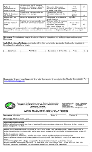 Este documento presenta las guías de trabajo por asignatura e periodo para Informática en los grados 7° y 9°. Los estudiantes realizarán una serie de talleres utilizando herramientas tecnológicas para construir proyectos de investigación sobre temas como el mundial de fútbol y su proyecto personal. Los proyectos serán evaluados y publicados en páginas web o blogs.