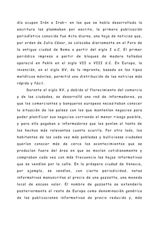 Este documento resume la historia de los medios de comunicación desde sus orígenes hasta el siglo XIX. Comenzó con la transmisión oral de noticias y la escritura en las primeras civilizaciones, pero la primera publicación periódica conocida fue la Acta Diurna en Roma en el siglo I a.C. La imprenta en el siglo XV permitió una distribución más rápida de noticias en Europa. Los primeros periódicos aparecieron en el siglo XVII y se expandieron en los siglos XVIII y XIX, a la vez que