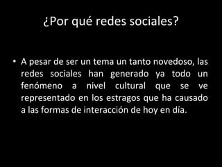El documento analiza las redes sociales, sus orígenes a inicios de los 2000, su popularidad debido a la búsqueda de amistad y compañía. Destaca ventajas como la facilidad de comunicación y distribución de información, pero también desventajas como violaciones a la privacidad y el uso de datos personales por empresas. Concluye que las redes sociales pueden ser entretenidas pero también explotadas por otros para aprovecharse de las personas.