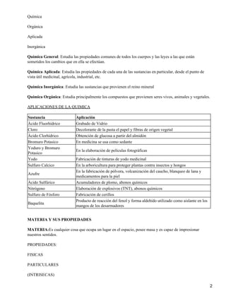 Este documento trata sobre conceptos básicos de química. Explica que la química estudia la composición y comportamiento de la materia, así como los cambios en su composición. Señala que la química está relacionada con ciencias como la física, biología, medicina y astronomía. Además, divide la química en ramas como la orgánica, inorgánica y aplicada. Finalmente, proporciona ejemplos de aplicaciones químicas en diversas sustancias e identifica propiedades físicas y