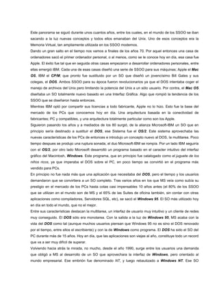 (1) Los primeros sistemas operativos aparecieron a finales de los 50 para ordenadores monousuario y monotarea, mientras que surgió el Multics en los 60 que incorporaba nuevos conceptos. (2) En los 70 aparecieron los primeros ordenadores personales y sus sistemas operativos como el Mac OS y DOS, y en los 80 surgió Windows y el éxito de Microsoft. (3) En los 90 el sistema operativo dominante era Windows pero apareció Linux como un clon de Unix de código abierto que se ha convertido en un importante sistema operativo
