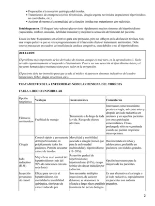 El documento describe diferentes tratamientos para el hipertiroidismo, incluyendo terapia antitiroidea con carbimazol o tiamazol, cirugía, yodo radiactivo, yodo, y betabloqueantes. El iodo radiactivo se usa comúnmente para tratar el hipertiroidismo y puede causar hipotiroidismo a largo plazo. Los antitiroideos se usan principalmente para tratar la enfermedad de Graves-Basedow en pacientes jóvenes y para preparar a pacientes para el tratamiento con iodo radiactivo.