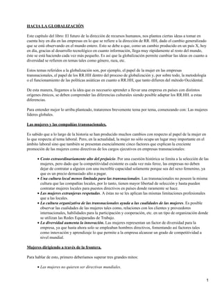 El documento habla sobre la globalización y su impacto en la dirección de recursos humanos. Explica que debido al desarrollo tecnológico, los cambios en un país se propagan rápidamente a nivel mundial. También discute cómo la globalización afecta temas como género y diversidad. Finalmente, argumenta que es necesario aprender a gestionar empresas en países con diferentes orígenes culturales y adaptar los recursos humanos a esas diferencias.