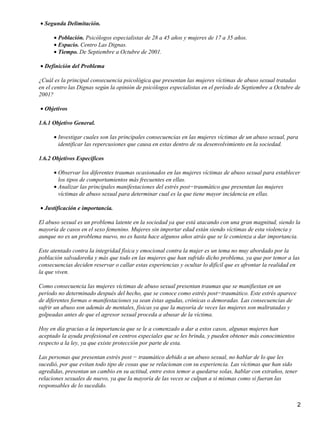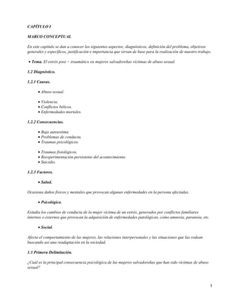 Este capítulo presenta el marco conceptual e histórico del estrés postraumático en mujeres salvadoreñas víctimas de abuso sexual. Explica las causas, consecuencias y factores del estrés postraumático, así como los objetivos generales y específicos del estudio. También resume varios antecedentes de tesis relacionadas con el maltrato y la violencia contra la mujer, incluyendo sus objetivos, hipótesis, muestras y conclusiones. Finalmente, analiza el contexto histórico de la violencia en El Salvador