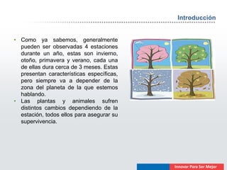 Este documento describe los cambios que ocurren en las plantas y animales durante las diferentes estaciones del año. Explica que en otoño las hojas de los árboles caducifolios cambian de color y caen para que el árbol pueda prepararse para el invierno. En invierno, las plantas descansan y los animales entran en hibernación o letargo. En primavera, las plantas brotan de nuevo y los animales se aparean. En verano, algunas plantas y animales sufren por la falta de agua.