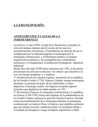 Este documento resume la independencia de Chile, comenzando con los antecedentes y causas que llevaron a la emancipación desde fines del siglo XVIII. Luego describe el período de la Patria Vieja (1810-1814) que incluyó la primera junta de gobierno en 1810, el gobierno de José Miguel Carrera, y la campaña de la Patria Vieja entre 1813-1814. Finalmente, resume brevemente la Reconquista española entre 1814-1817 y el establecimiento de la Patria Nueva bajo la dictad
