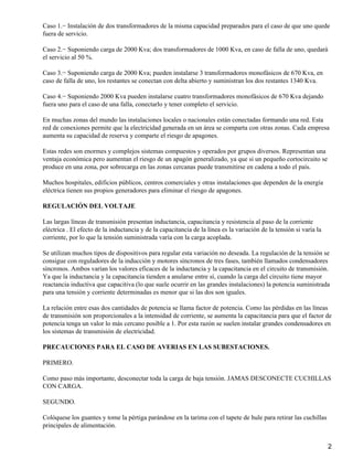 1) El documento describe los componentes y funcionamiento de las subestaciones eléctricas, incluyendo secciones para medición, interruptores, transformadores y gabinetes de baja tensión. 2) Explica los casos para instalar múltiples transformadores para garantizar el suministro eléctrico en caso de fallas. 3) Detalla los sistemas de conexión a tierra y regulación de voltaje para asegurar la seguridad y estabilidad del suministro eléctrico.