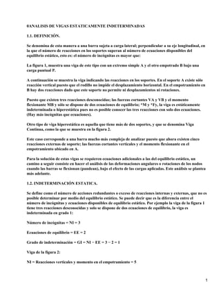 Este documento analiza vigas estáticamente indeterminadas mediante diferentes métodos. Explica que este tipo de vigas tienen más reacciones desconocidas que ecuaciones de equilibrio disponibles, por lo que se requieren ecuaciones adicionales. Presenta varios problemas resueltos utilizando el método de la doble integración y los teoremas de Otto Mohr, donde se calculan las reacciones, momentos y deformaciones de vigas sometidas a diferentes cargas.