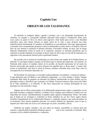 Este documento explica los orígenes y usos de los talismanes. Un talismán es cualquier objeto cargado con símbolos mágicos para atraer una fuerza o alcanzar un objetivo específico. Tradicionalmente se inscribían con palabras hebreas o griegas y se construían en torno a los símbolos de los planetas o signos zodiacales que rigen ese objetivo. También se explican los cuadrados mágicos y cómo extraer sigilos de ellos para inscribir en los talismanes.