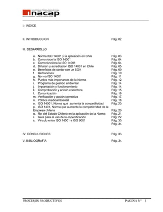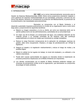 Este documento presenta información sobre la norma ISO 14001 para la gestión ambiental. Explica que ISO 14001 especifica los requisitos para un sistema de gestión ambiental efectivo y que más de 20,000 empresas a nivel mundial han obtenido la certificación. También describe los beneficios de la certificación ISO 14001, como mejorar la imagen corporativa, ahorrar costos y asegurar el cumplimiento de la legislación ambiental. Finalmente, proporciona detalles sobre la implementación de ISO 14001 en Chile, incluidas las empresas que han obtenido la cert