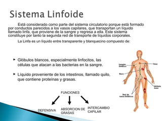 El documento describe el sistema linfático, que transporta un líquido llamado linfa a través de vasos similares a los capilares. Explica que los órganos del sistema linfático se dividen en primarios (médula ósea y timo) y secundarios (ganglios, bazo, amígdalas, placas de Peyer). Luego describe las funciones y características de cada uno de estos órganos en el sistema inmunológico y de defensa del cuerpo.