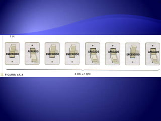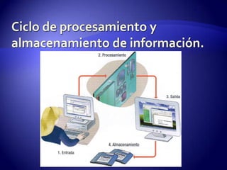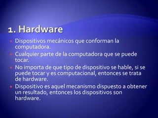 El documento describe las cuatro partes principales de una computadora: hardware, software, datos y usuario. El hardware se refiere a los componentes físicos de la computadora. El software son las instrucciones que permiten a la computadora realizar tareas. Los datos son piezas de información procesadas por la computadora. Finalmente, los usuarios interactúan con la computadora para ingresar datos e instrucciones y obtener resultados.