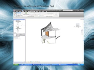 Se crearon elementos geométricos en Sketchup y se vincularon archivos .skp a Revit para crear muros, losas y otros elementos por masa. El archivo de Revit se vinculó a 3D Studio Max a través de un archivo .sat. En Rhinoceros se creó una cubierta para la terraza del proyecto y se importó a Revit. También se creó una cubierta, escalera y baranda para la terraza del segundo piso en Revit.