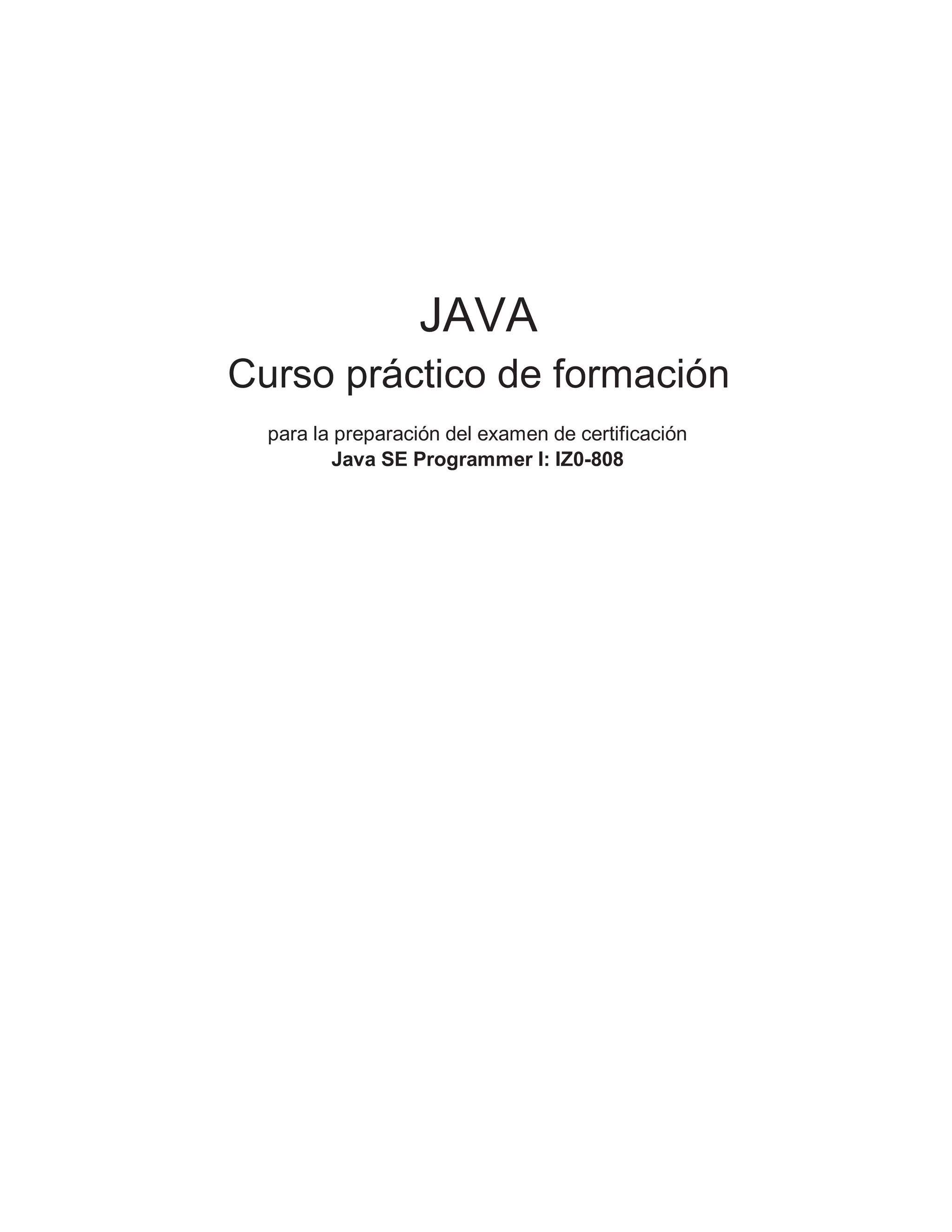 Este documento presenta un curso práctico de formación para la preparación del examen de certificación Java SE Programmer I: IZ0-808. El curso fue escrito por Antonio Martín Sierra y publicado por Alfaomega Grupo Editor en México. El documento contiene 284 páginas e incluye 9 capítulos que cubren temas como fundamentos de Java, tipos de datos, operadores, arrays, estructuras de control, métodos, herencia, excepciones y clases del API de Java.