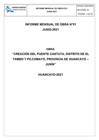 El informe mensual describe el progreso de la construcción del Puente Cantuta en Junín durante junio de 2021. Los avances físicos más significativos fueron 25% de movilización de equipos, 100% de trazo y replanteo inicial y 9% de energía eléctrica para la obra. El avance físico total fue de 0.53%, por debajo de la meta de 1.38%, debido principalmente a retrasos en la fabricación de fundas metálicas para pilotes. El informe también incluye detalles sobre la ubicación, objetivos, anteced