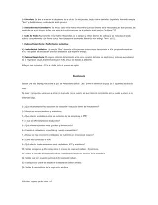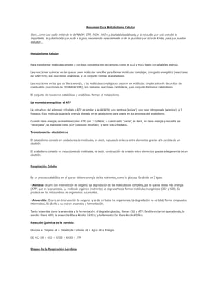 El documento resume los conceptos clave del metabolismo celular, incluyendo la glucolisis, el ciclo de Krebs y la respiración aeróbica. Explica que la glucolisis degrada la glucosa en el citoplasma para producir energía en forma de ATP, y que el ciclo de Krebs y la fosforilación oxidativa completan la degradación de moléculas en la mitocondria para liberar más energía. También contrasta la respiración aeróbica con la anaeróbica y la fermentación, señalando que la aer