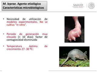 Este documento describe las características clínicas y microbiológicas de la lepra. Explica que M. leprae es el agente etiológico que crece de forma intracelular obligatoria en el ser humano. Describe las diferentes manifestaciones cutáneas, neurológicas y sistémicas de las distintas formas clínicas de la lepra: indeterminada, tuberculoide, lepromatosa nodular y difusa, y dimorfa. También cubre aspectos del diagnóstico y las complicaciones como las reacciones leprosas