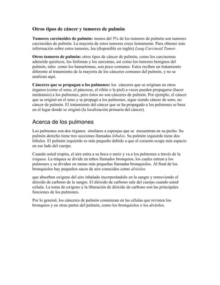 Este documento describe el cáncer de pulmón microcítico (células pequeñas), incluyendo su definición, estadísticas, factores de riesgo y detalles sobre la anatomía pulmonar. Representa alrededor del 10-15% de los cánceres de pulmón y se asocia principalmente con el humo del tabaco. Las tasas son más altas en hombres que en mujeres y aumentan con la edad. Otros factores de riesgo incluyen la exposición a radón, asbesto u otras sustancias químicas