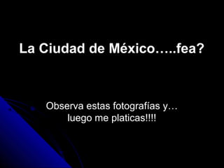 El documento presenta una serie de fotografías de la Ciudad de México, destacando su belleza y características emblemáticas como la Plaza de las Tres Culturas y el Ángel de la Independencia. A través de estas imágenes, invita a reconsiderar la percepción negativa de la ciudad y ofrece enlaces para descargar más contenido. La narrativa busca generar interés y discusión sobre la riqueza cultural y paisajística de la capital mexicana.