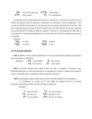 Regla: Para poner el artículo definido en hebreo, se agrega la letra h antes de la palabra, luego una páotá ̇ debajo de h, y finalmente un dagesh forte en la primera consonante de la palabra. Hay excepciones para palabras que comienzan con guturales, donde se usa alargamiento compensatorio en lugar de dagesh forte.