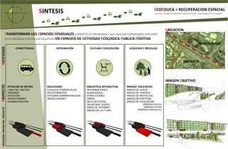 El documento presenta un proyecto de recuperación de espacios residenciales abandonados en las comunas de Huechuraba y Recoleta en Santiago. El proyecto consiste en transformar estas áreas en un parque educativo con biblioteca interactiva, áreas verdes, juegos, viveros y reciclaje para mejorar la calidad de vida de los residentes. El proyecto se financiaría a través de una alianza público-privada entre el estado, municipios, empresas y fondos de patrocinio.