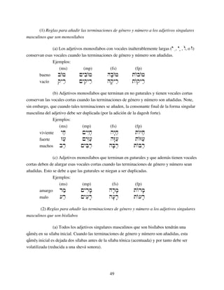 El documento proporciona una lista de adjetivos comunes en hebreo y explica las reglas gramaticales para su uso. Explica que los adjetivos en hebreo toman terminaciones para indicar género y número del sustantivo que describen. Luego detalla las reglas para añadir estas terminaciones a adjetivos monosílabos y bisílabos. Finalmente, distingue entre el uso atributivo y predicativo de los adjetivos y ofrece ejemplos.