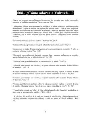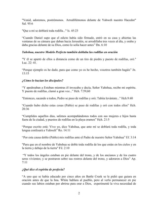 El documento discute cómo debemos adorar a Dios de acuerdo a las Escrituras. Señala que tanto Jesús como los discípulos se arrodillaban al orar, y cita numerosos versículos donde personas bíblicas como Moisés, Josué y Daniel también se arrodillaban. Afirma que debemos adorar a Dios con humildad y temor reverente dado su infinita grandeza.