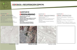 El grupo EcoEduca propone transformar espacios residenciales sin uso o con uso negativo en áreas públicas de actividad ecológica positiva. Su proyecto analiza el orden urbano de un área entre las comunas de Huechuraba y Recoleta, identificando líneas, flujos, áreas, tramas, topografía, densidades y divisiones sociales. Su propuesta consiste en crear un hito verde entre las autopistas que integre ambas comunas y el parque metropolitano, recuperando un espacio para la ciudad.