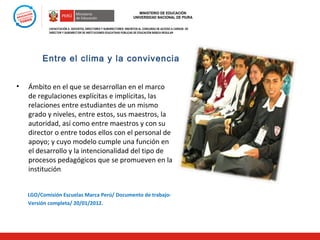 El documento describe una capacitación para directores y subdirectores de escuelas públicas. La capacitación cubre temas relacionados a la convivencia escolar, el clima institucional y la construcción de normas consensuadas. Se explica que un buen clima promueve el aprendizaje y que la participación de todos los actores educativos es importante para establecer una convivencia democrática.