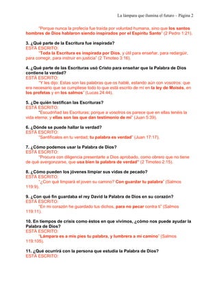 El documento resume un curso bíblico sobre la Palabra de Dios como la lámpara que ilumina el futuro. Explica que la Biblia contiene un tesoro escondido para cada persona, y que al estudiarla se pueden descubrir verdades que transforman vidas. También destaca que las profecías bíblicas se han cumplido con precisión a través de los siglos, lo que demuestra la confiabilidad de las Escrituras.